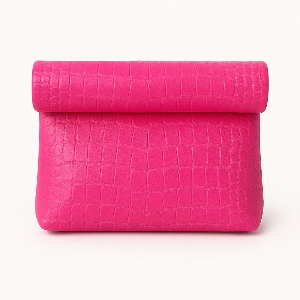 The Meny Croc-Embossed Roll-Up Clutch is a statement of bold femininity and elevated edge. Crafted in a striking bubblegum pink faux-crocodile leather, this oversized clutch features a distinct roll-top closure that folds into itself, blending structure with softness. The matte gloss texture enhances its sculptural silhouette while offering a tactile, high-fashion finish.