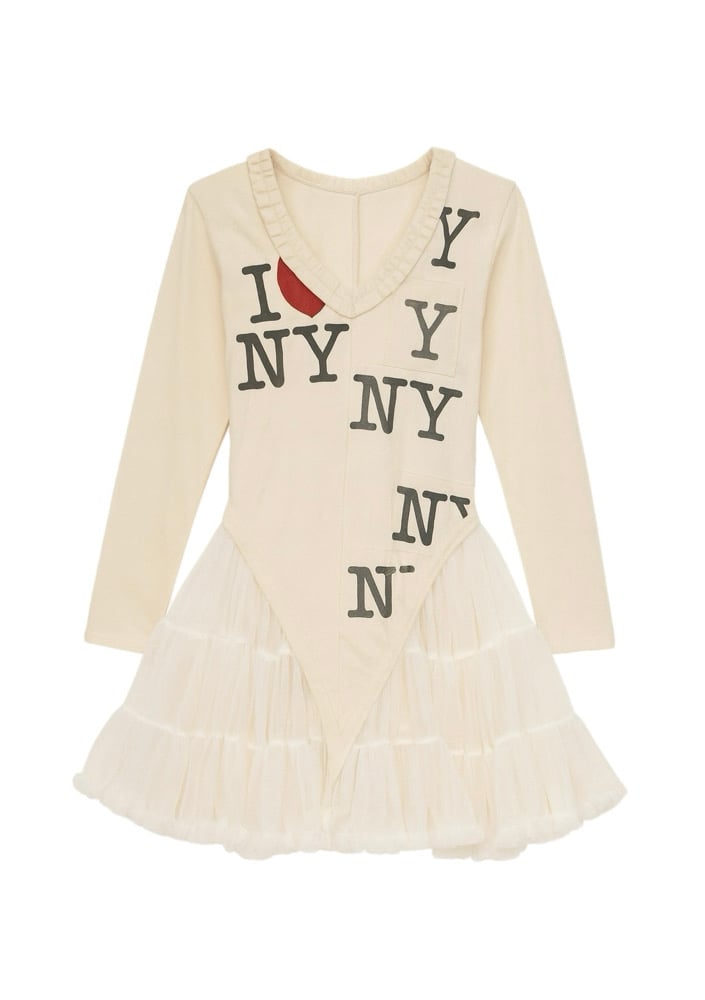 This one-of-a-kind dress is made entirely from 100% upcycled vintage “I ❤ NY” cotton T-shirts and finished with a 100% nylon layered tulle skirt. The fitted long-sleeve top highlights original logo prints, hand-cut and sewn into a sculptural bodice with a ruffled V-neckline. A tiered tutu-style skirt adds playful volume, transforming casual streetwear into an elegant statement piece.