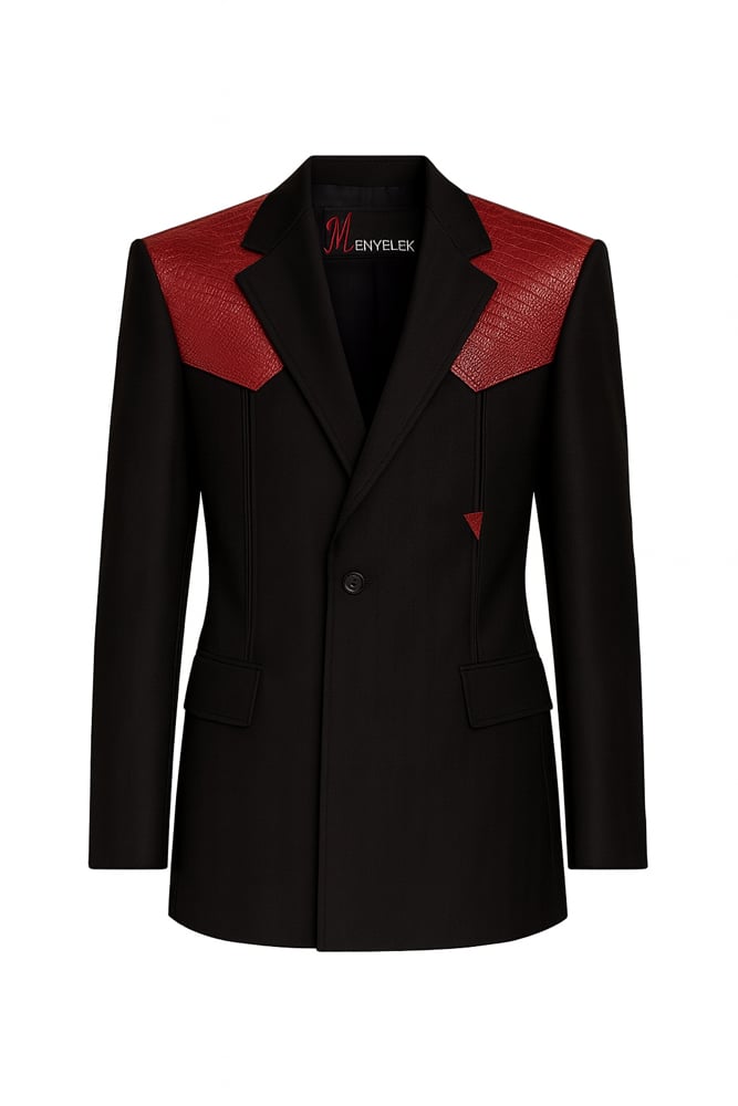 Commanding and refined, the Sovereign One blazer is cut in jet-black suiting fabric and distinguished by its bold red croc-embossed leather shoulders. This sharp silhouette balances precision tailoring with statement detail, creating a piece that is both modern and timeless. Featuring structured lapels, flap pockets, and a single-button closure, the jacket offers a streamlined shape that flatters while exuding strength. Finished with the MENYELEK woven label inside, it embodies the brand’s philosophy of reinvention and artisanal luxury.